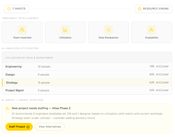 Upload a simple Excel or QuickBooks Time export, and Octayne instantly builds structured employee profiles while mapping people → projects → hours to reconstruct your firm’s true delivery patterns.