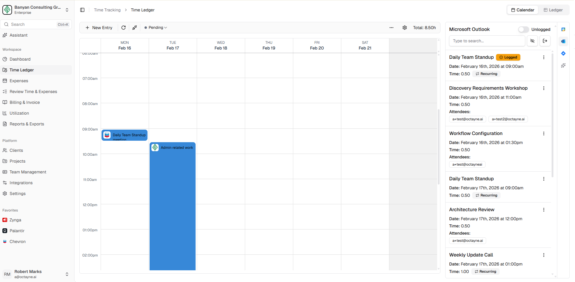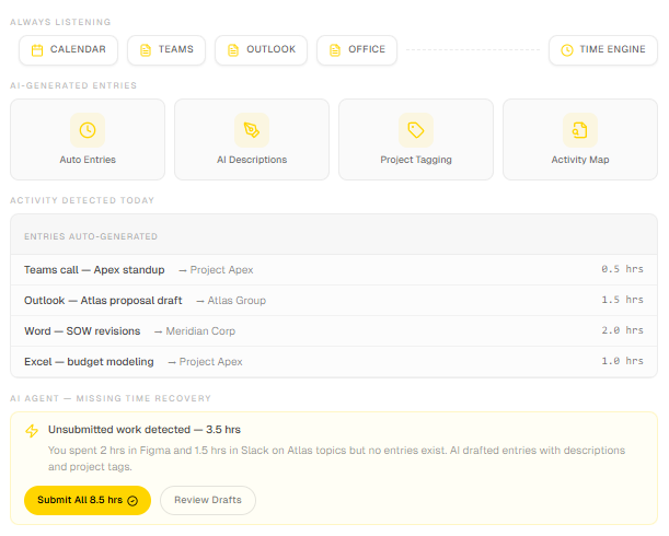 Connect Microsoft 365 to automate time from meetings, emails, files, and Teams activity — no manual entry required.